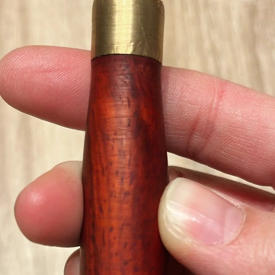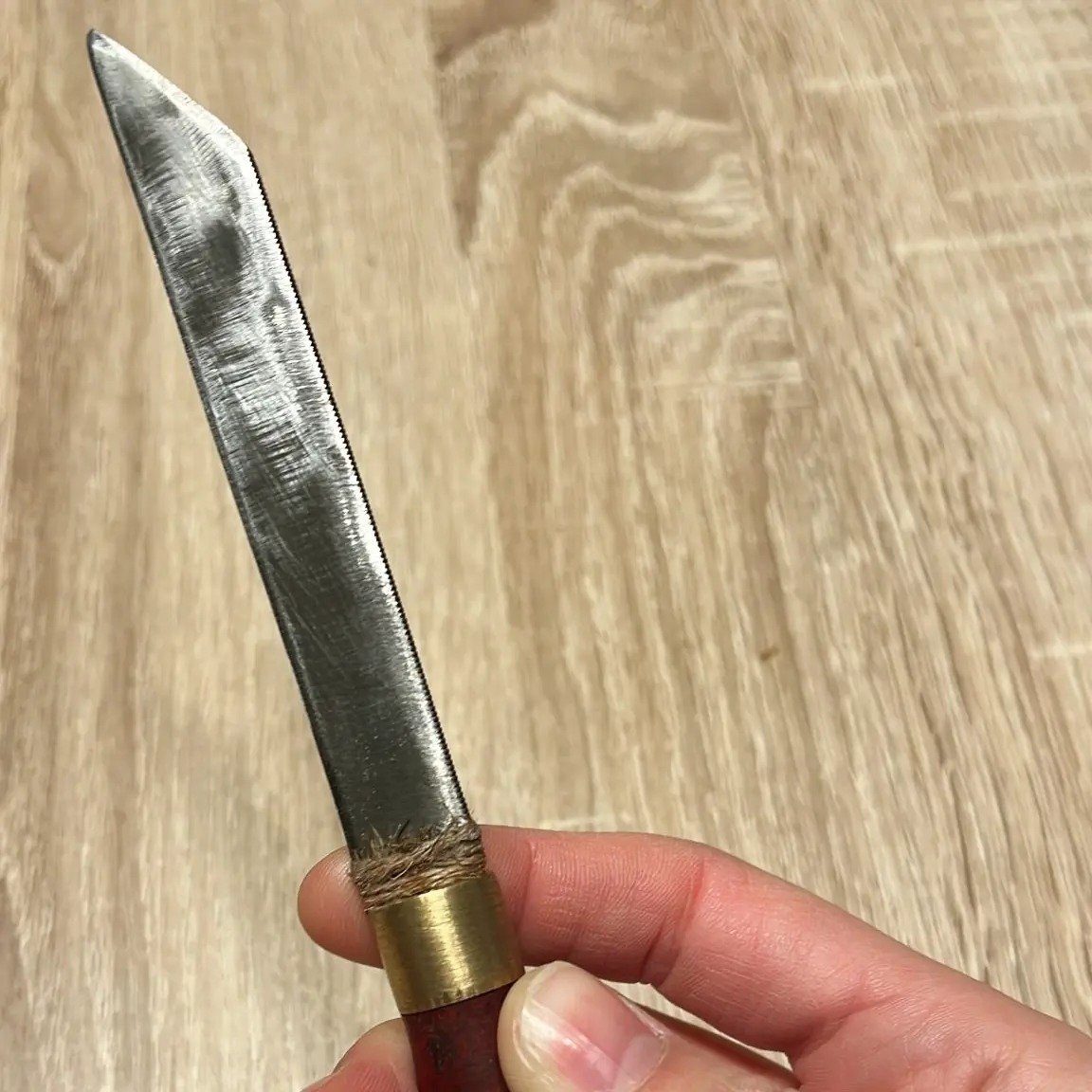 Couteau en acier trempé de vieille lime, garde en corde et laiton et manche en padouk.